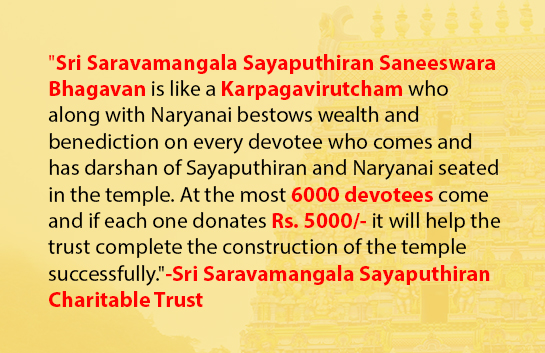 Please send the amount in favour of the Sri Sarvamangala Sayaputhiran Sevaimaiyam Charitable Trust (Donation to the Trust is exempt U/S 12 AA Under (E) 2 (67) 97-98/Dt.3.9.97.) .No18/29.Mannar Street, T.Nagar, Chennai-600017, Mobile No: 9941243702 or : 7010002112On his/her behalf a prayer will be done for Lord Sri Saneeswara Bhagavan blessings. Then prasdham will be sent to his/her address.